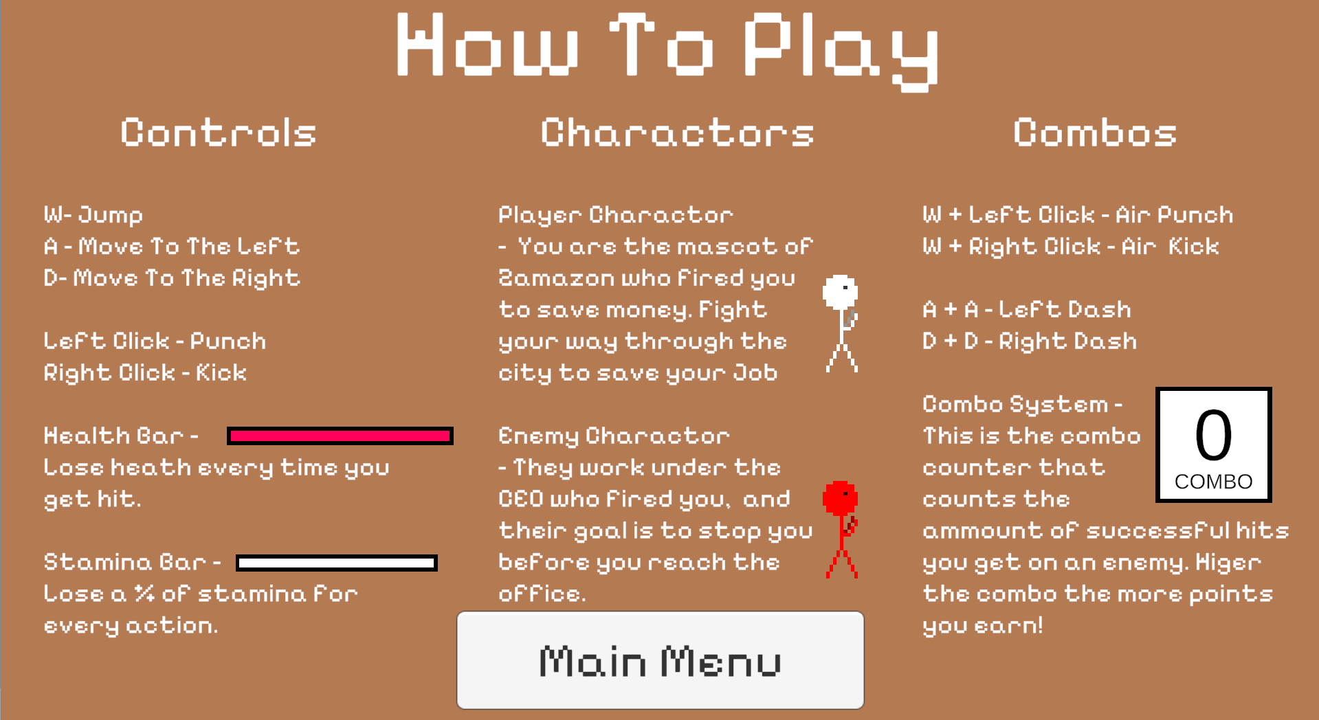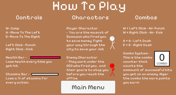 You are the mascot for one of the biggest companies in the world, Zazamon. That was until the new CEO, who in an effort to cut company funding for a larger bonus for himself at the end of the year, fired you unjustly, and now your stuck in the suburbs near the office. Fight against the CEO's underlings who block your path back to the factory, and they pack a punch. Fight back to the factory, so you can get your job back!